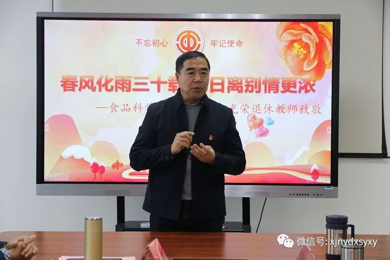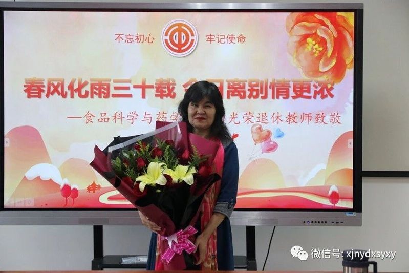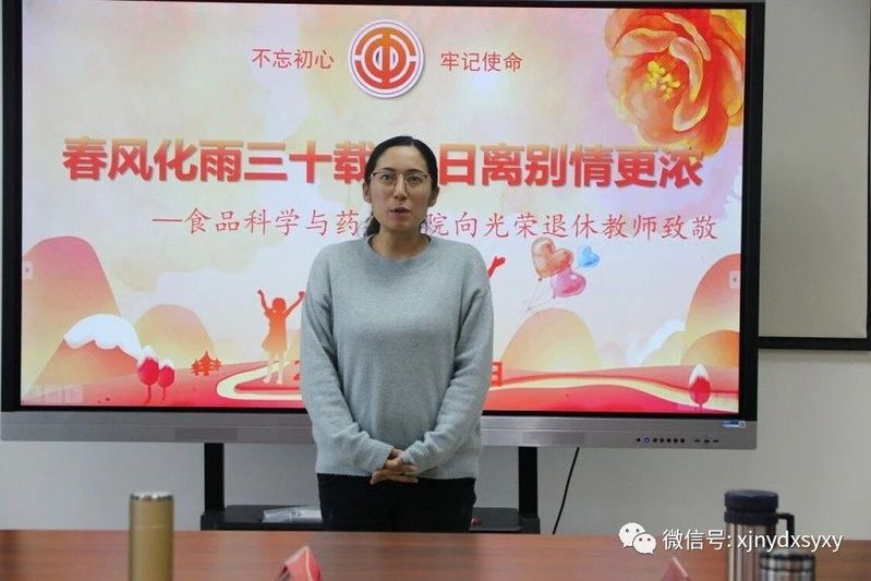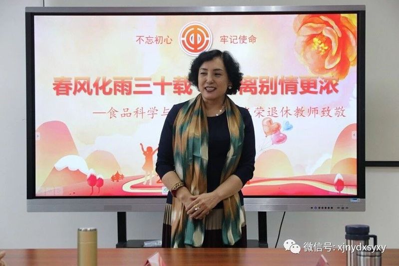 会上年轻教师代表尼格尔热依·亚迪卡尔分享:“两位教师的退休只是执教生涯的结束,但是老教师的精神将会一直引领我们前进,学院的现在是您们创造的,学院的未来将由我们年轻一代教师担当!”