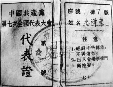 毛泽东出席七大的代表证