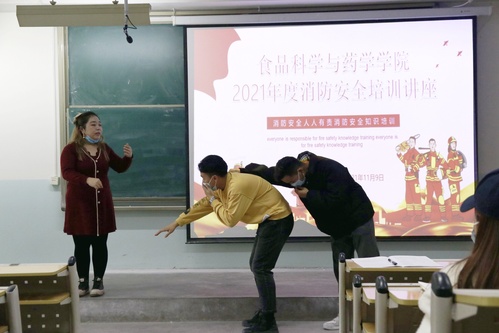 学院全体研究生在2325教室同步观看了讲座直播。研究生辅导员于晨晨在讲座结束后带领进行了消防安全经验分享。她讲到,研究生应在科研工作过程中注意消防安全,形成“人人关心消防、处处注意防火”意识。21级研究生王晨分享到,遇到火灾时心理素质很重要,不慌乱才能快速的把火灭掉,所以更要熟练掌握消防器材的使用方法。21级研究生王梓棚、马杰为大家进行了逃生姿势的演示。