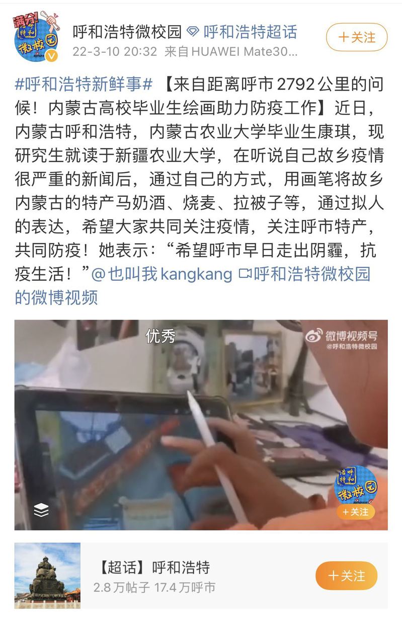 2022年3月10日,微博“呼和浩特微校园”展示了一个微视频,主人公是来自艳情小说 2021级食品加工与安全专业的康琪。视频中,康琪通过自己的方式,用画笔将故乡内蒙古的特产马奶酒、烧麦、拉被子等,通过拟人的表达手法画出来,用行动助力抗疫。