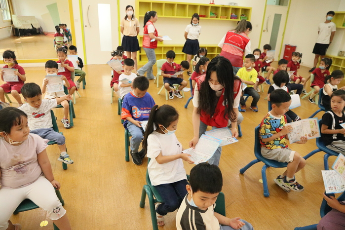 在小朋友们齐欢唱《健康饮食儿歌》中宣讲落下了帷幕,志愿者们向大家发放了食品科普知识宣传单。