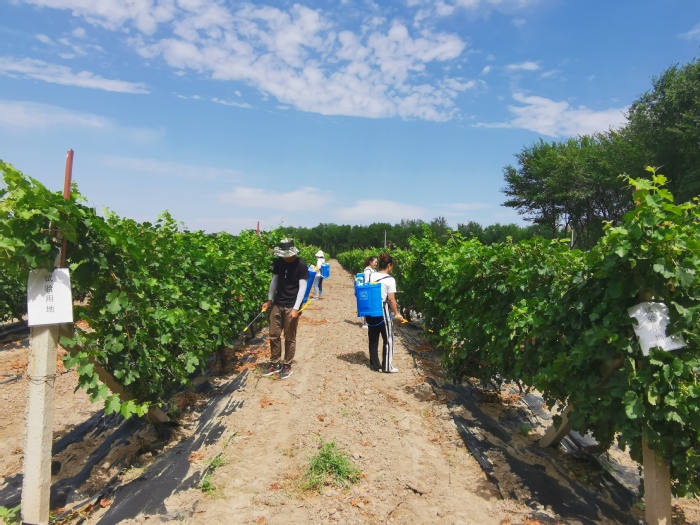 实践团第一站前往中信国安葡萄酒业股份有限公司。在葡萄生长发育阶段分为膨大期时进行田间观察葡萄生长状态,由相关专业老师在田间地头进行实地教学,讲解膨大期葡萄种植管理的注意事项。实践团同学们参与此阶段葡萄田间管理工作,进行合理喷施用药防治病虫害,与当地酒庄及农户共同进行常规水肥管理操作工作。真正做到了理论联系实际,教学结合生产。