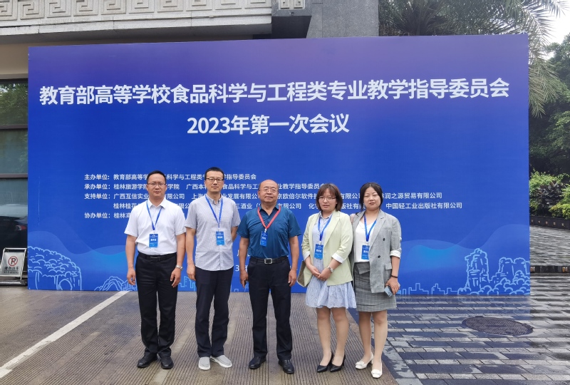 为深入学习贯彻习近平新时代中国特色社会主义思想主题教育,深化国家级一流本科专业建设,强化专业课程思政建设,全面提高人才培养质量,5月26日-28日,教育部高等学校食品科学与工程类专业教学指导委员会2023年第一次会议在广西桂林召开,我院院长王子荣、副院长周建中、食品营养与安全系主任王伟、科研秘书高蕾、党政办主任白云洁参加了会议。