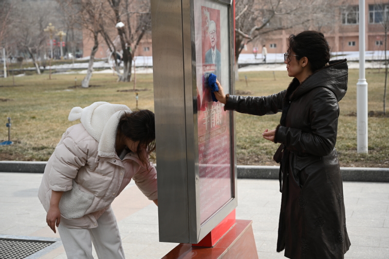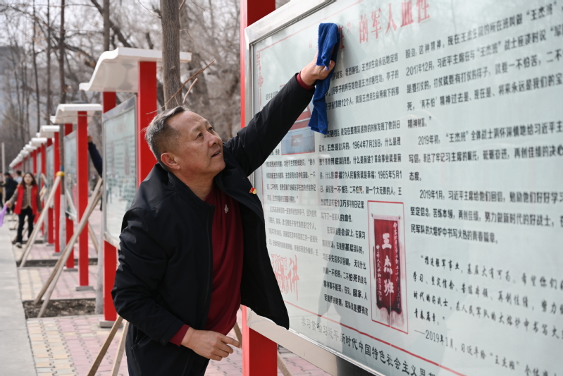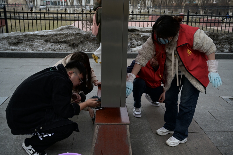 下午四点,人员集合完毕,大家领取工具,分别对校园八一大道、习近平总书记故事园卫生清洁及擦拭工作。在支部支委们的带领下,党员同志们干劲十足,针对校园卫生死角,逐一进行清理,听从指挥,认真仔细地完成清扫任务。
